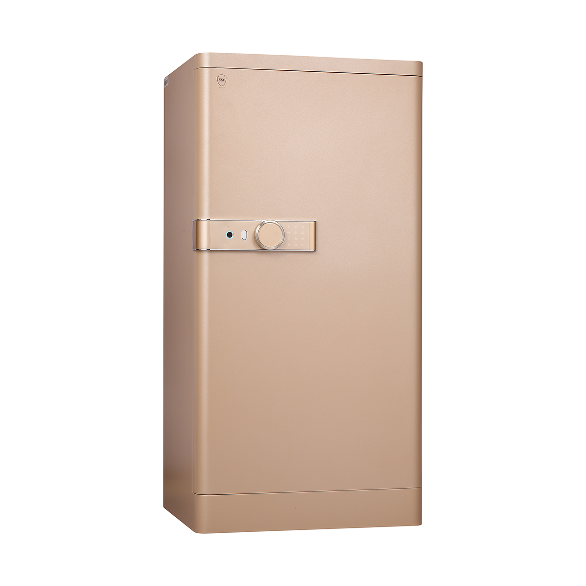 Transcending the limits of traditional safe design to become a "Masterpiece Furniture." Designed with a Minimalist Luxury concept, the body features a Champagne Gold matte finish with elegant curved edges. It integrates an intelligent locking system via a touchscreen interface and highly accurate fingerprint scanning.