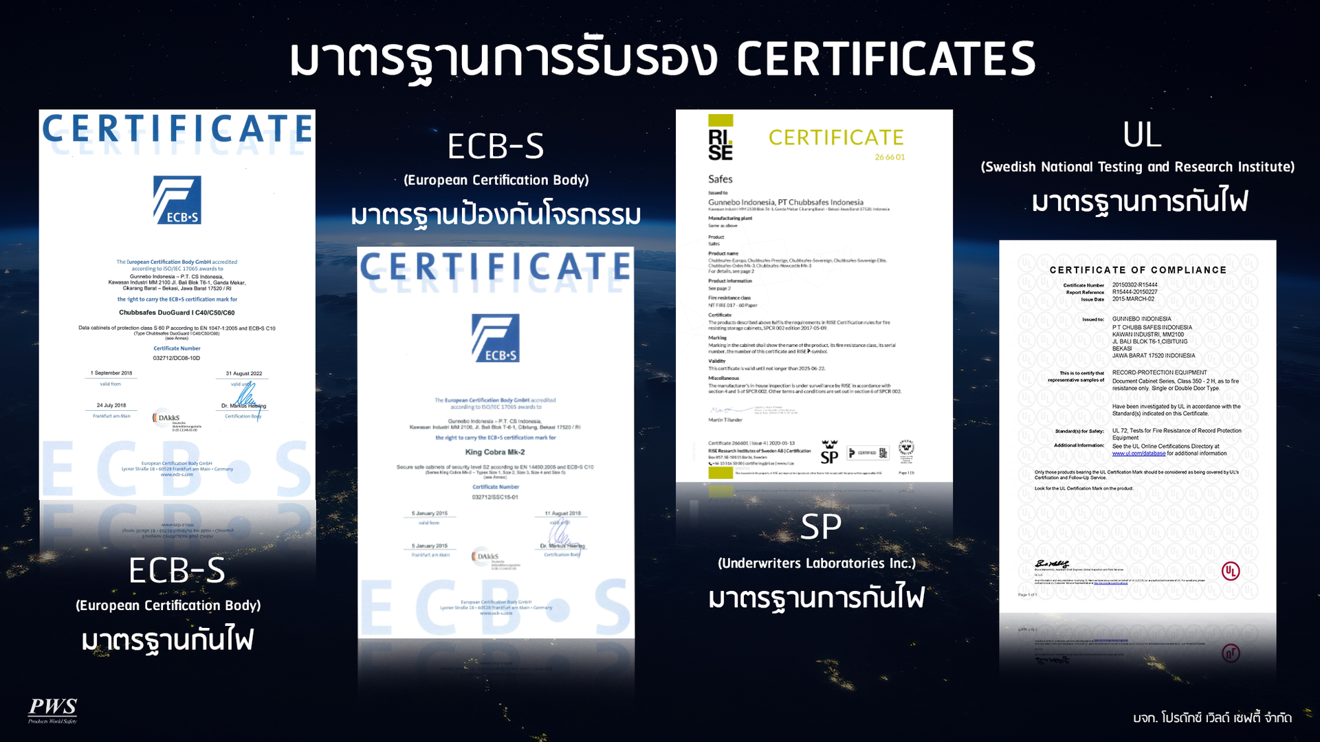 สิ่งหนึ่งที่ทำให้ Chubbsafes เหนือกว่าตู้เซฟทั่วไปคือ "ใบรับรอง" ที่ไม่ใช่แค่คำโฆษณา แต่เป็นการทดสอบจริงจากสถาบันระดับโลก เช่น