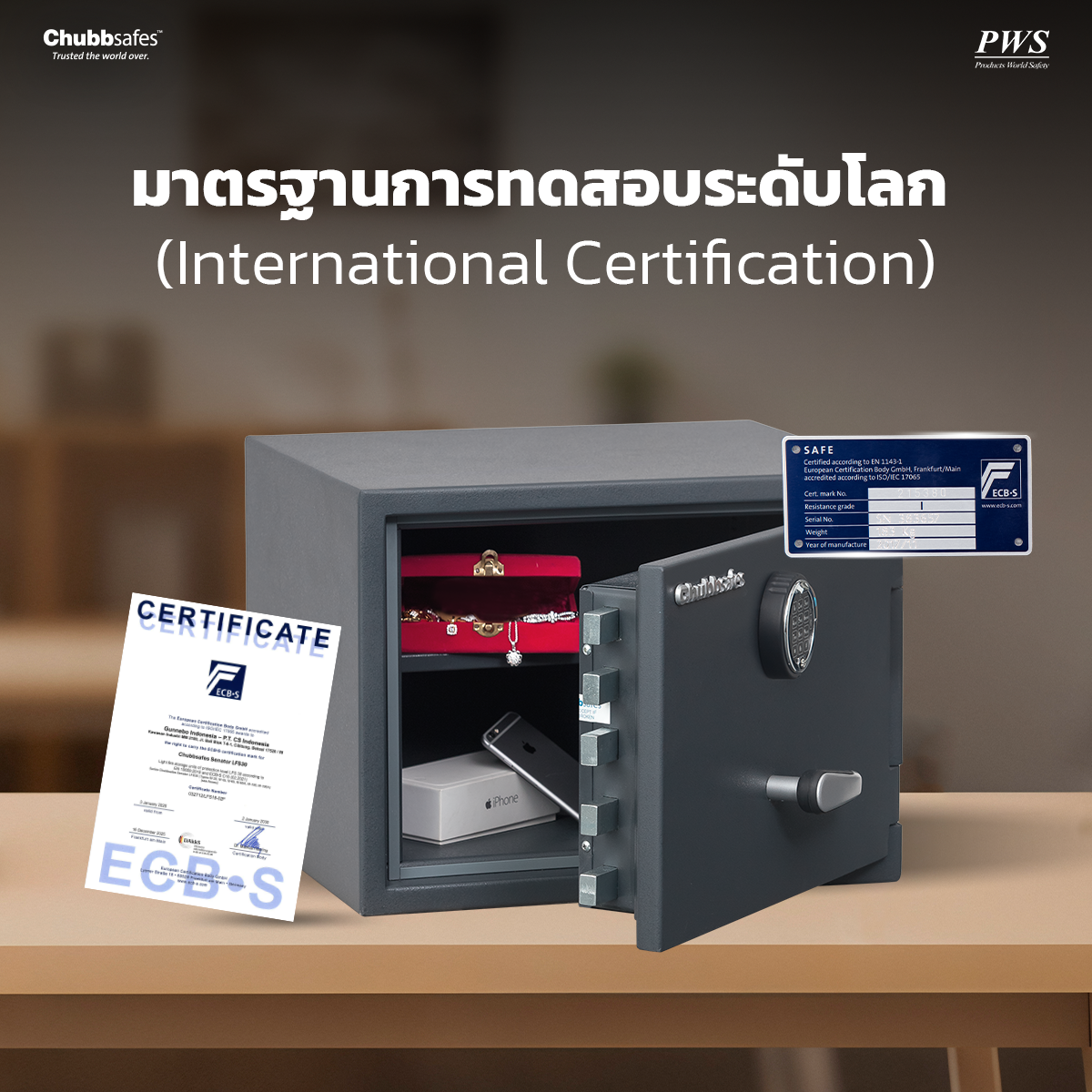 ตู้เซฟทั่วไปอาจเคลมว่ากันไฟหรือกันขโมยได้ แต่ Chubbsafes มาพร้อมกับใบรับรองจากสถาบันทดสอบระดับสากล เช่น ECB•S (ยุโรป) หรือ UL (สหรัฐอเมริกา) * ตู้เซฟทั่วไป มักใช้มาตรฐานการทดสอบภายในโรงงานเอง