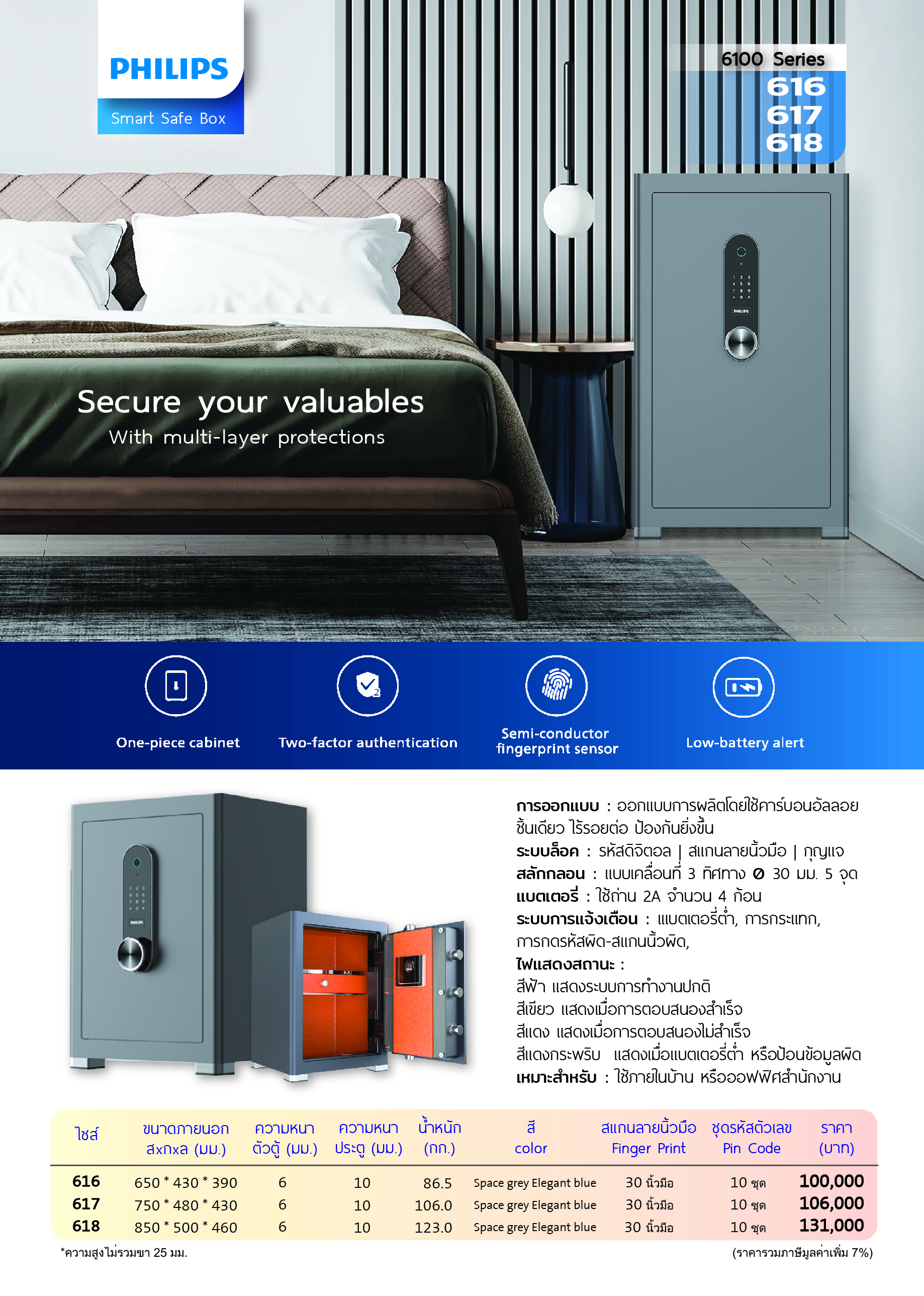 6100 Series รองรับการปลดล็อกที่หลากหลาย ทั้งการสแกนลายนิ้วมือ, รหัสผ่าน (PIN code) และกุญแจฉุกเฉิน มอบประสบการณ์การเข้าถึงที่สะดวกสบายและรวดเร็วอย่างเหนือระดับ ผสานความมั่นใจด้วยระบบ "การยืนยันตัวตนแบบคู่ (Dual Authentication Mode)" และโครงสร้างตัวตู้แบบหล่อขึ้นรูปชิ้นเดียว (One-piece cabinet) เพื่อสร้างพื้นที่จัดเก็บที่แข็งแกร่งและปลอดภัยสูงสุดสำหรับทุกทรัพย์สินมีค่าของคุณ