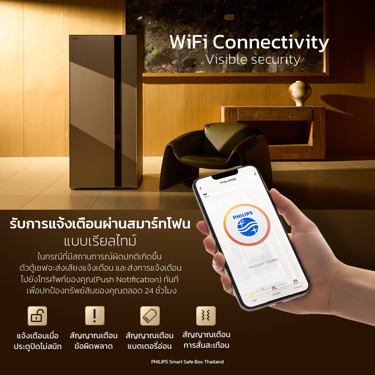 - การแจ้งเตือน : แบตเตอรี่ตำ, ประตูปิดไม่สนิท, การสั่นสะเทือน ,การกดรหัสผิด