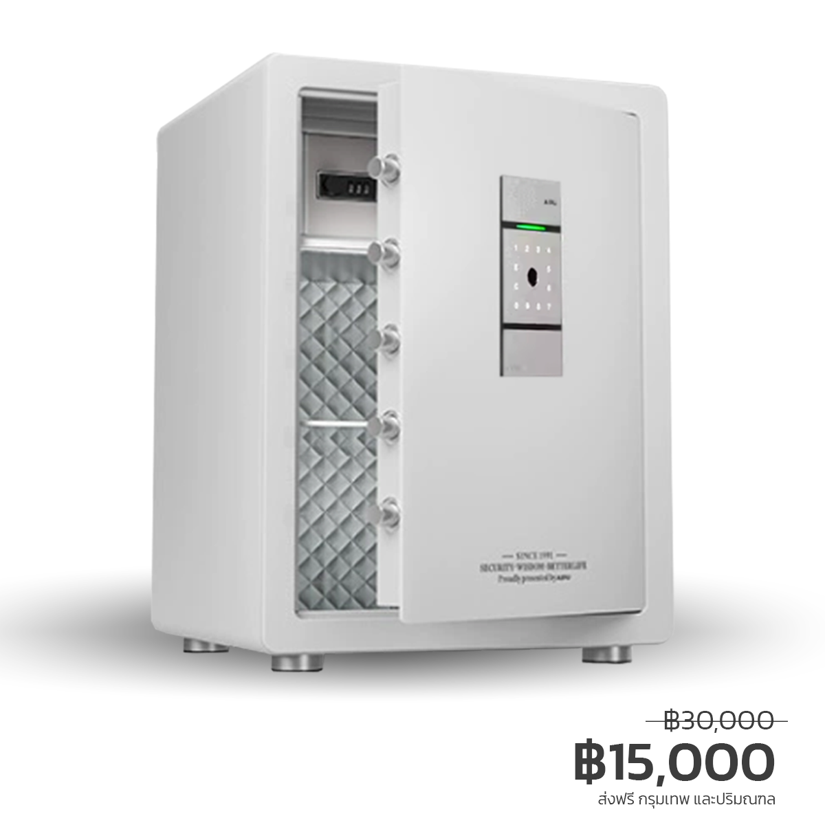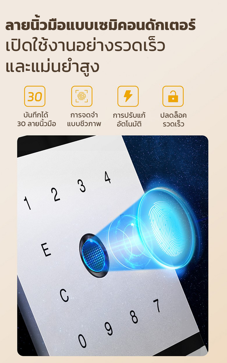 - บานประตู: เด้งเปิดอัตโนมัติ เมื่อกดรหัสผ่านหรือสแกนนิ้วถูกต้อง